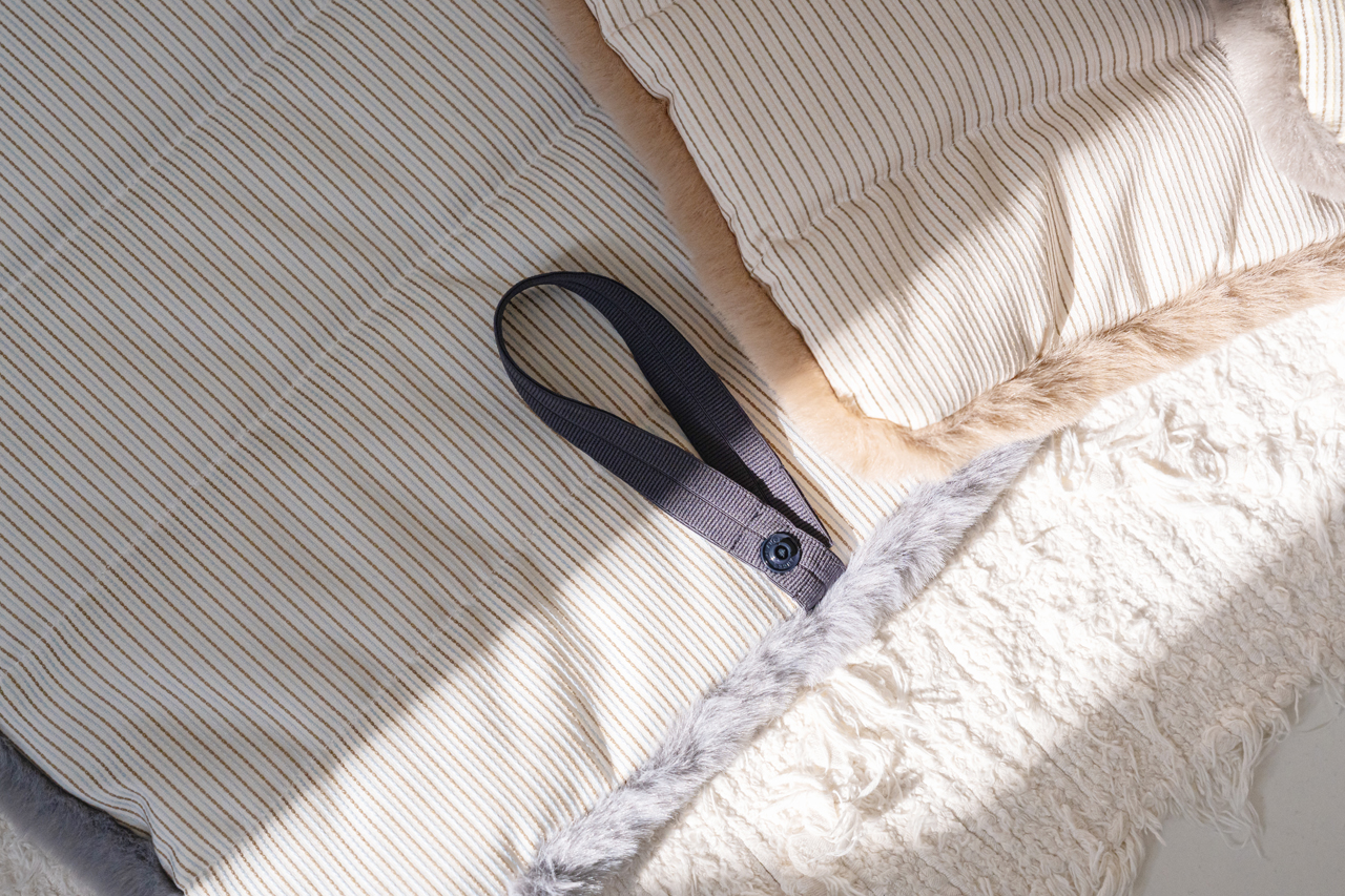 3M 신슐레이트를 내장재로 사용해 우수한 보온성과 풍성한 볼륨감이 오래 유지되며, 뒷면에는 포인트가 되어주는 스트라이프 코튼 소재를 배색해 양면으로 활용할 수 있도록 완성도를 높였어요.
