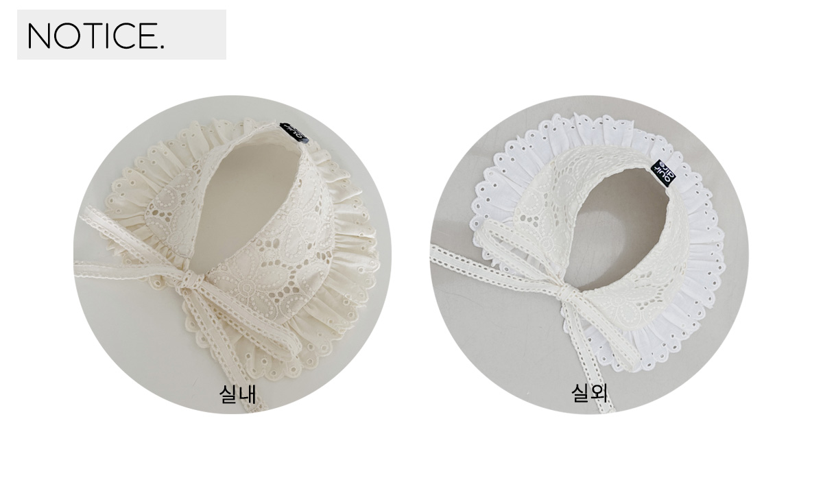 이베리스 카라의 꽃무늬가 있는 자수원단과 끝부분 프릴원단의 소재원사 차이로 동일한 칼라. 동일한 염료로 염색이 되어도 실내전등과 실외자연광에서 보여지는 칼라가 다르게 보여질수 있습니다.