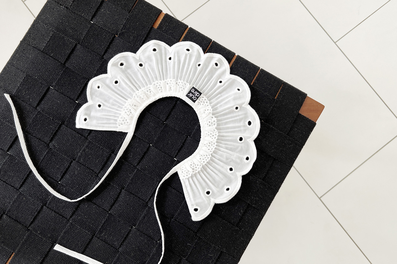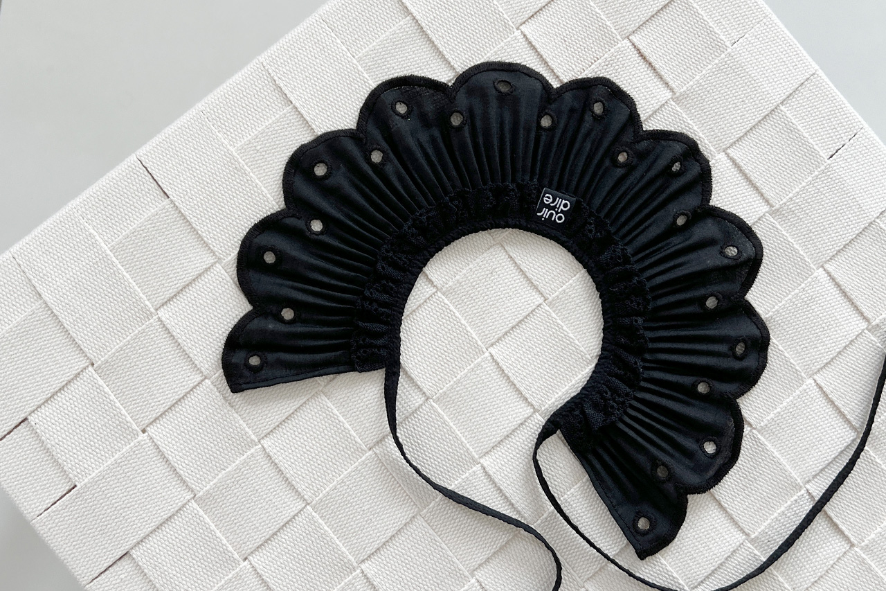 세밀하게 잡힌 플리츠와 스칼럽 라인을 따라 형성된 촘촘한 자수가 특징인 봉봉카라는