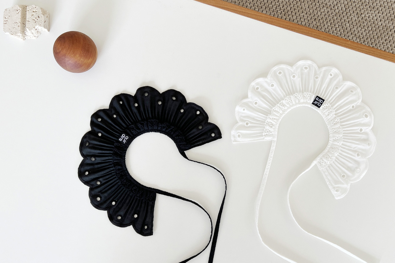 세밀하게 잡힌 플리츠와 스칼럽 라인을 따라 형성된 촘촘한 자수가 특징인 봉봉카라는 고시감이 있는 단단한 소재에 플리츠 디테일을 더해 착용시 카라의 형태가 무너지지 않고 형태감을 그대로 유지하여 더욱더 꾸띄르한 느낌을 더해준답니다!