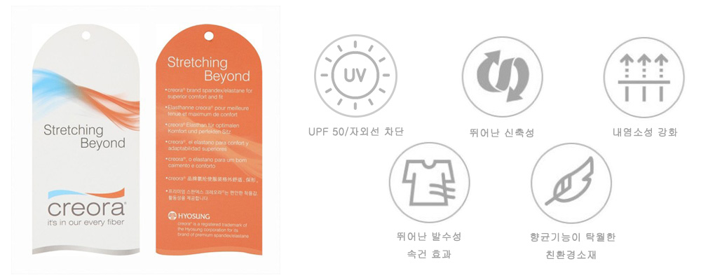 - 세계적인 기능성 섬유 업체인 효성의 프리미엄 스판덱스 크레오라 소재를 사용하였습니다.