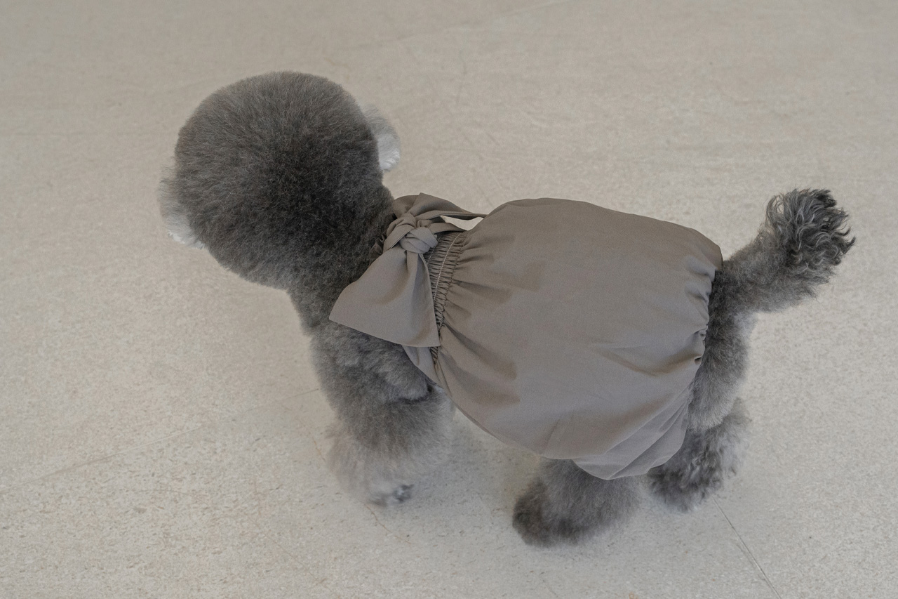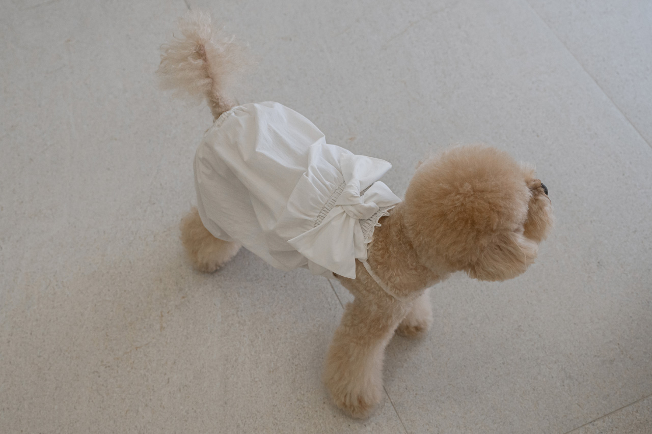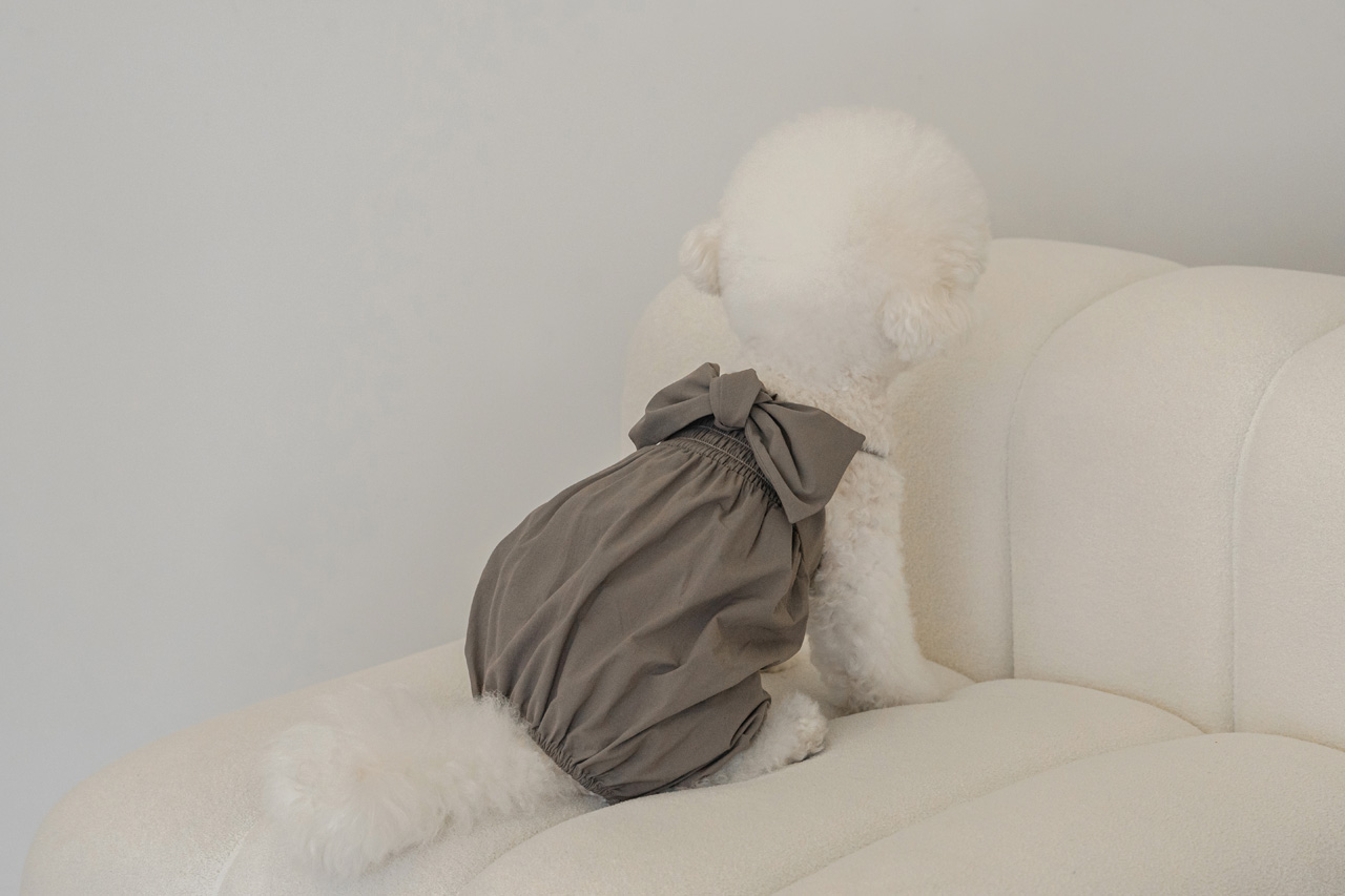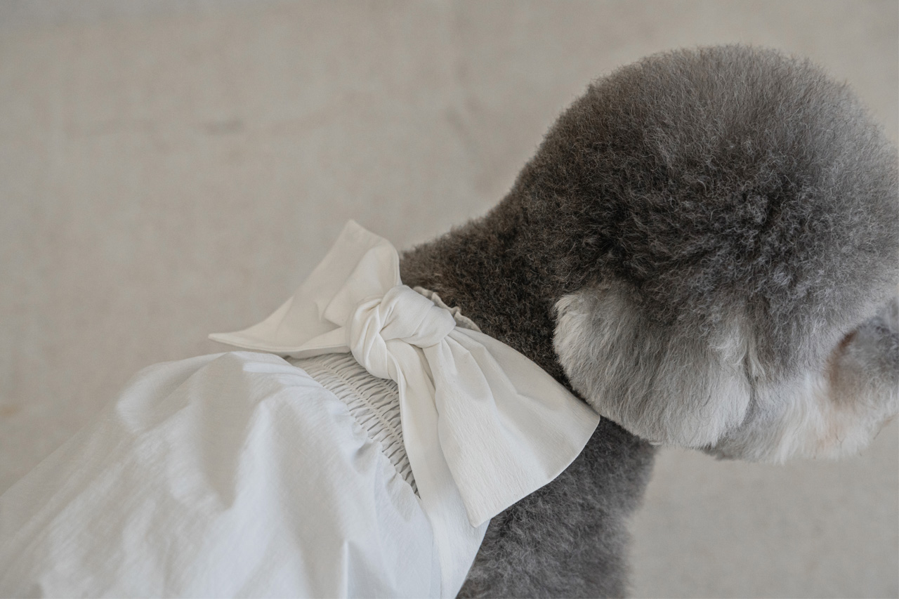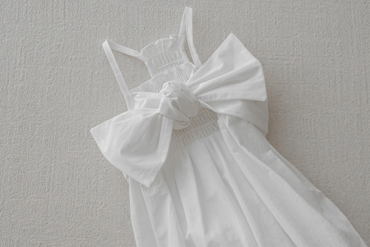 상의의 전판 스모킹으로 편안한 피팅감을 선사하고 형태감있는 리본 디테일로 한번 더 잡아주어